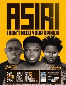 ASIRI: I Don’t Need Your Opinion is coming to Eko Hotels & Suites, VI, Lagos on September 28th! Get ready for an unforgettable night of comedy, storytelling, and bold truths.